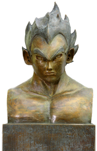 Manga Bronze, 2003 / 2004, ca 190 cm hoch  Diese Skulptur stellt einen Königssohn dar. Im Augenblick der Abbildung befindet er sich in der Phase der Metamorphose vom Jüngling zum Mann, einer ultimativen Superkampfmaschine mit überirdischen Kräften und phantastischen Fähigkeiten ausgestattet. Vom Kinn bis Nasenansatz Kind. Die Augen und alles andere seiner Gestalt ist Mischwesen, ähnlich den Kentauren aus der griechichen Mythologie.